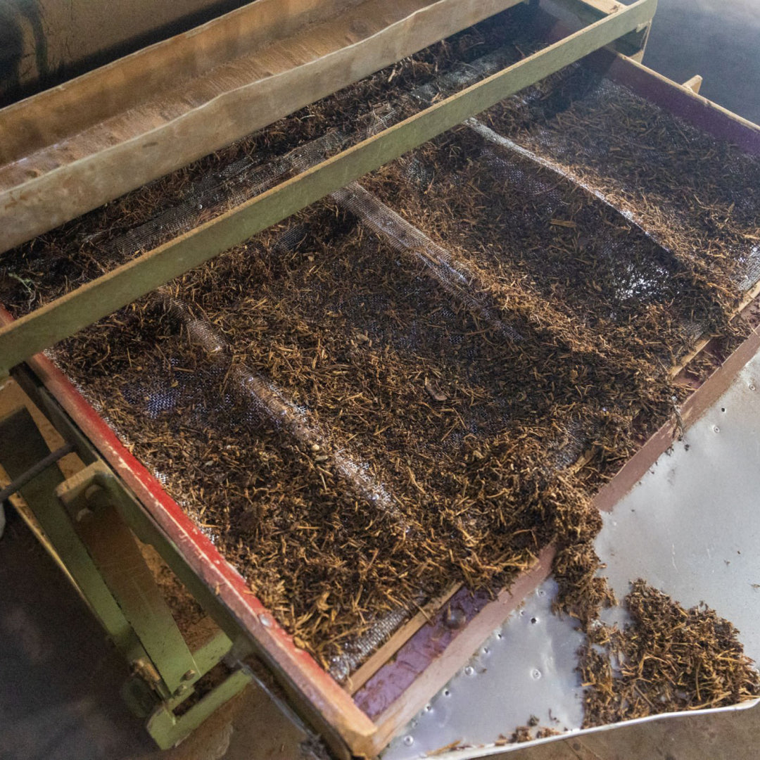 The other method is to roast the tea leaves in a rolling machine. This method is used to produce hojicha tea on a larger scale. The leaves are turned very quickly so they heat evenly. If large quantities of hojicha tea are being produced, the farmer must separate the leaves by size. The small leaves roast faster than the larger leaves, so they undergo entirely different processes.