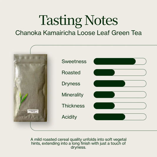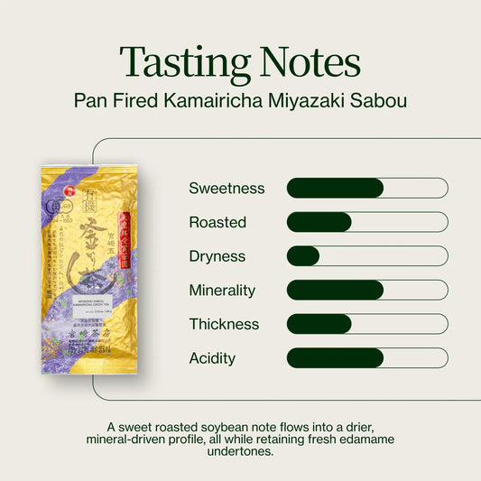 The flavor of Kamairicha plays more on these nutty notes, with flavors of almonds, toasted cashews and roasted seaweed. This tea does a great job at combining the warmer taste profiles of fully roasted teas, with the fresher and more vegetal flavors of unroasted teas.