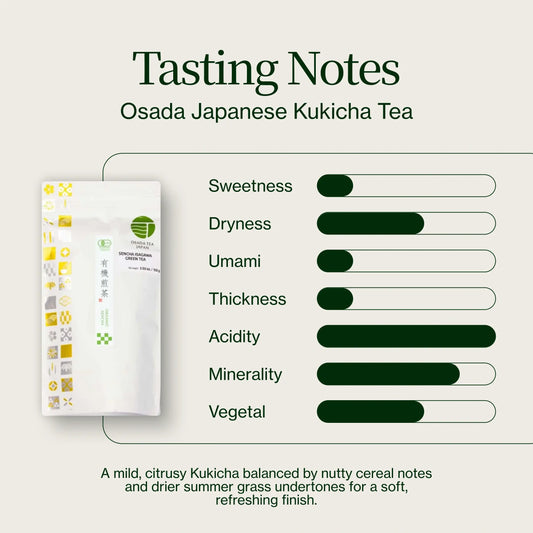 Kukicha tea is a green tea made from the stems and leaves of the tea plant. By mixing the stems into the tea, a farmer is able to produce a lower caffeine tea with a milder, hay or straw like flavor profile. These teas tend to be higher in minerals, and you can feel this minerality as a tingling sensation on the palate.
