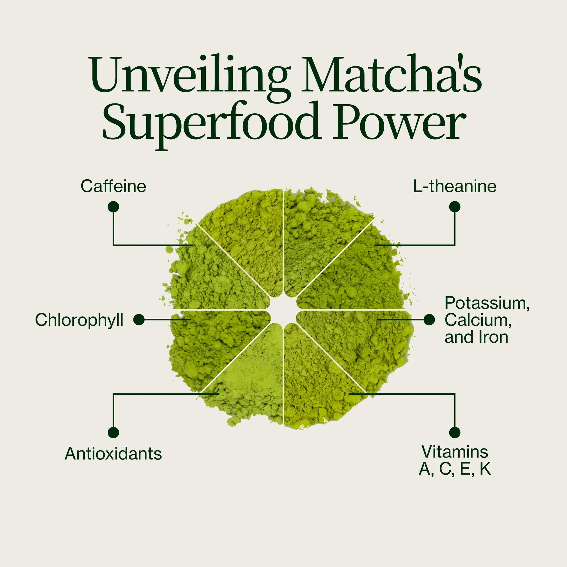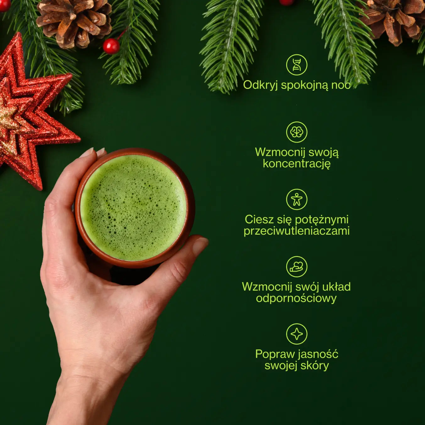 Matcha jest bogata w silne przeciwutleniacze, naturalną kofeinę i uspokajające aminokwasy, które zapewniają długotrwałą energię, jasność umysłu i poczucie spokojnej koncentracji. Wspomaga ogólne samopoczucie, przyspiesza metabolizm i wzmacnia układ odpornościowy, dzięki czemu jest idealnym dodatkiem do codziennej rutyny lub świątecznego rytuału.