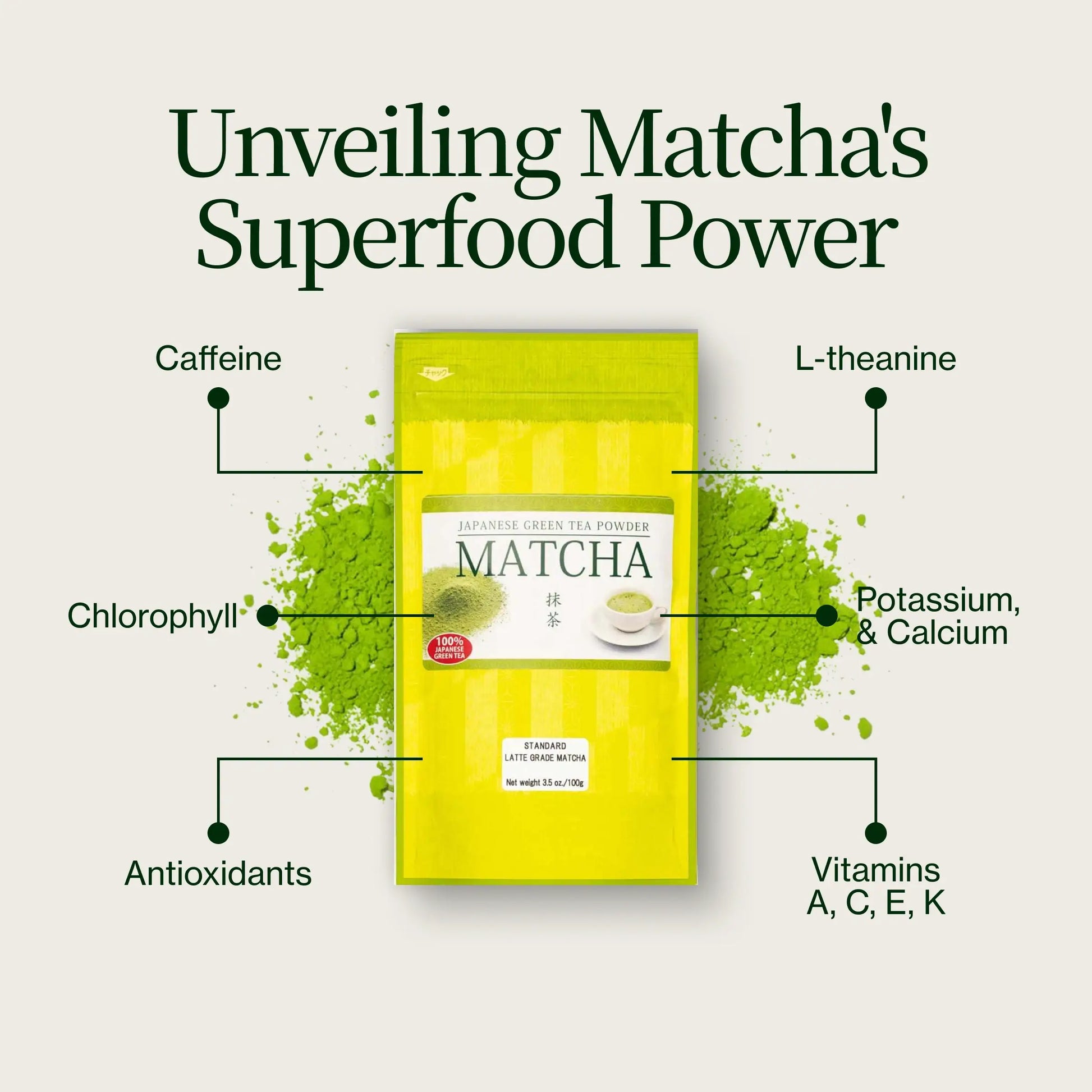 To opakowanie zawiera 100 gramów sproszkowanej herbaty, wystarczającej do przygotowania 50 latte Matcha
